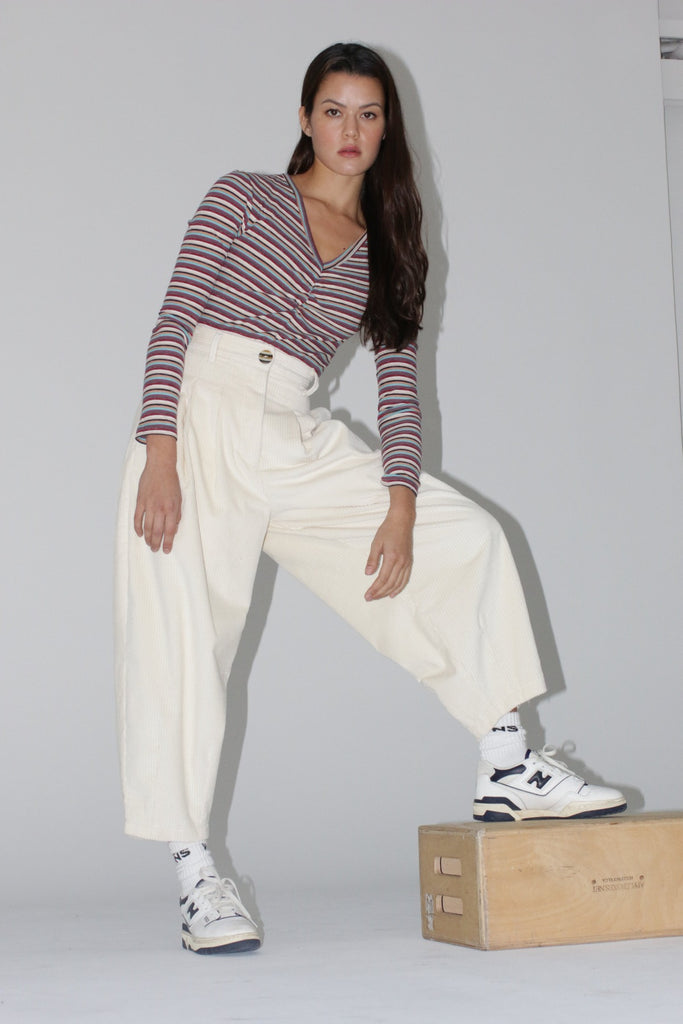 Pleat front trouser pants with balloon leg and slight crop. Runs small at the waist. We suggest sizing up.