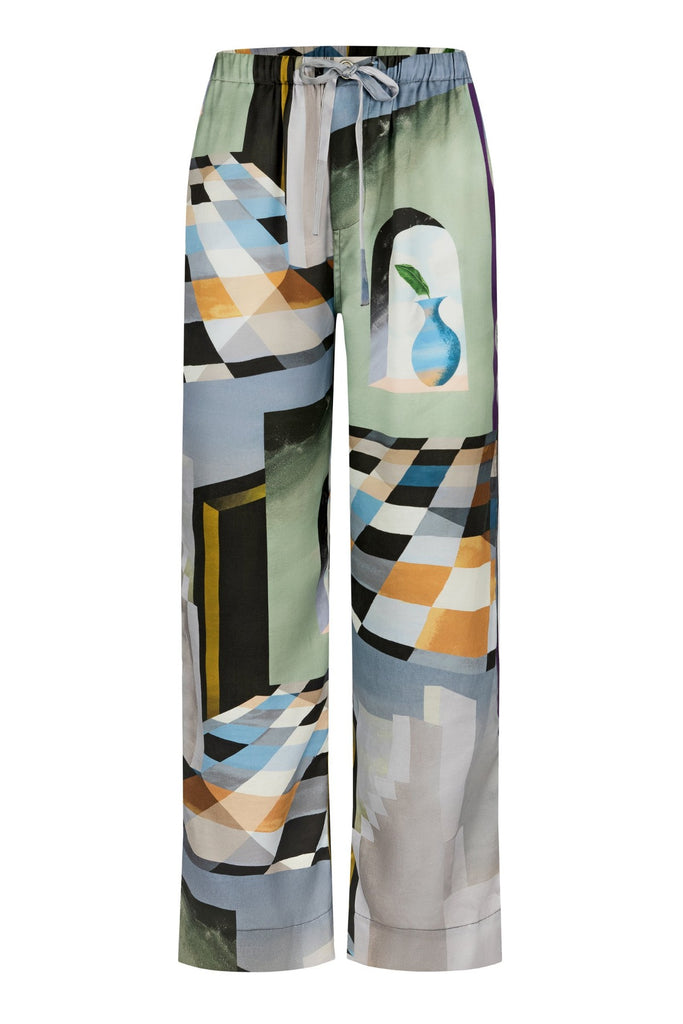The Intuition Pant has an elasticized waist with a front button fly and an adjustable drawstring. Sits at natural waist with relaxed hip. Two side seam hip pockets and a back pocket. Straight leg with piping at side seam, back pocket and shell buttons. Crafted from breathable TENCEL™ Luxe with silky twill finish, in custom artwork print Piazza.