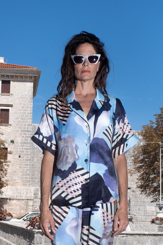 The Dream Top is a slightly oversize fit with dropped shoulder and wide, easy short-sleeve. Traditional notched collar with piping at the placket and cuffs. Rounded hem and shell buttons. Crafted from breathable TENCEL™ Luxe with silky twill finish, in custom artwork print Metafisica.