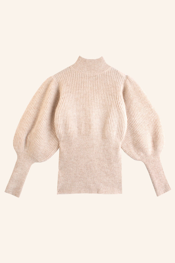Lantern sleeve rib-knit sweater with fitted cuffs, high neck and fitted waistline.