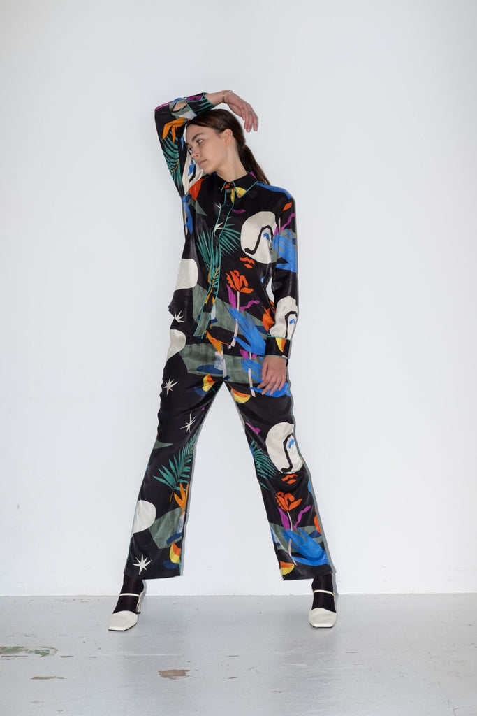 The Manifest Top is a long-sleeve button down top with a relaxed shoulder and easy fit. Piping at the button placket and cuffs. The top has a slightly longer length at back with the hem hitting at the low hip and side vents. Crafted from breathable TENCEL™ Luxe with silky twill finish, in custom artwork print Séance.