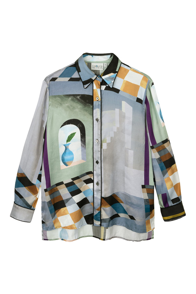 The Manifest Top is a long-sleeve button down top with a relaxed shoulder and easy fit. Piping at the button placket and cuffs. The top has a slightly longer length at back with the hem hitting at the low hip and side vents. Crafted from breathable TENCEL™ Luxe with silky twill finish, in custom artwork print Piazza.